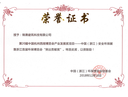 中國安全環(huán)保展暨浙江首屆環(huán)保博覽會突出貢獻(xiàn)獎